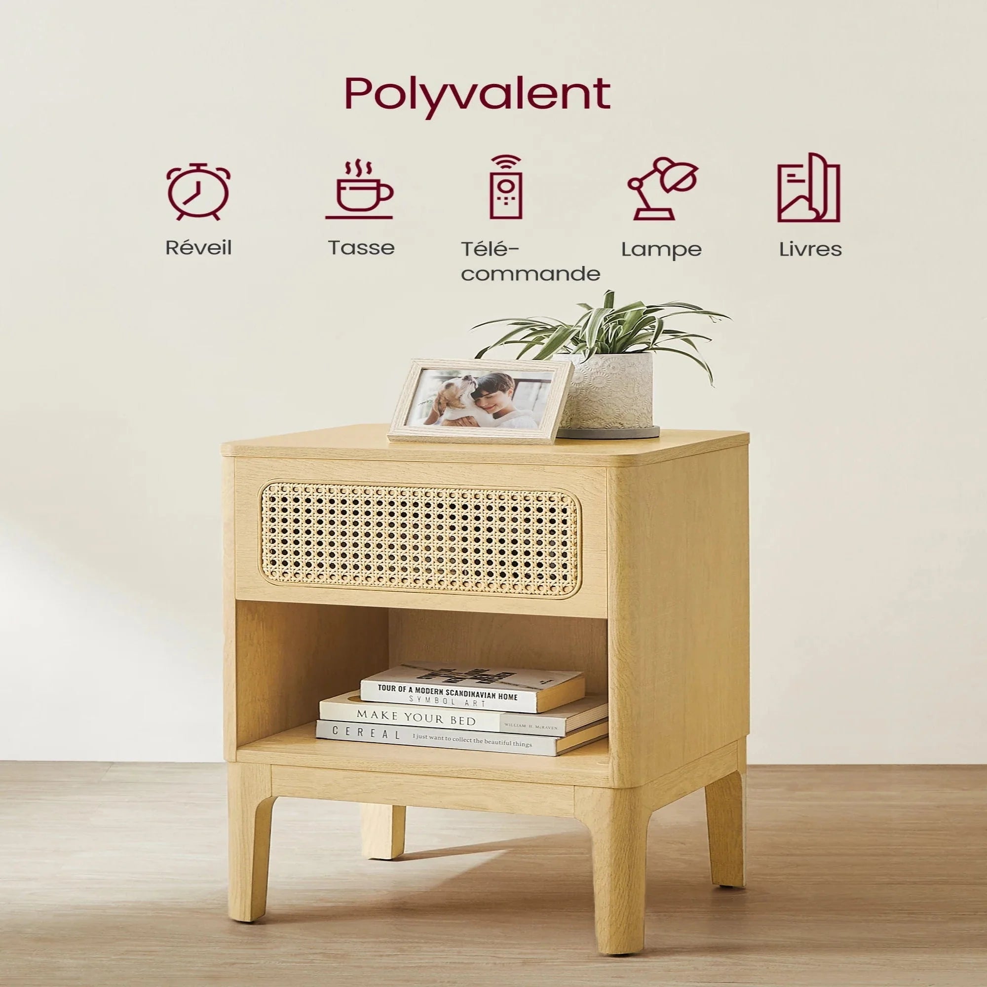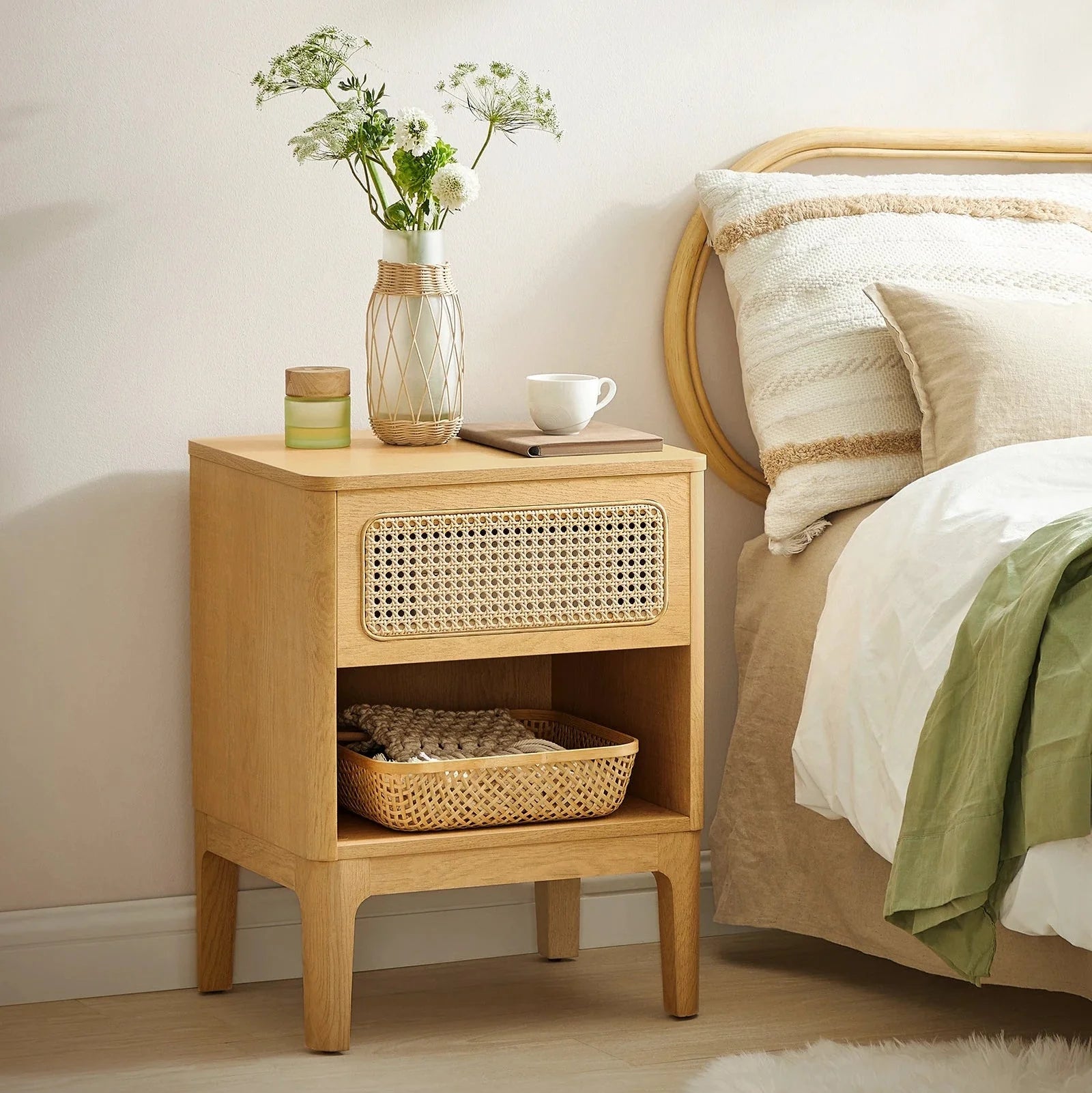 Bedside table in wood and natural rattan